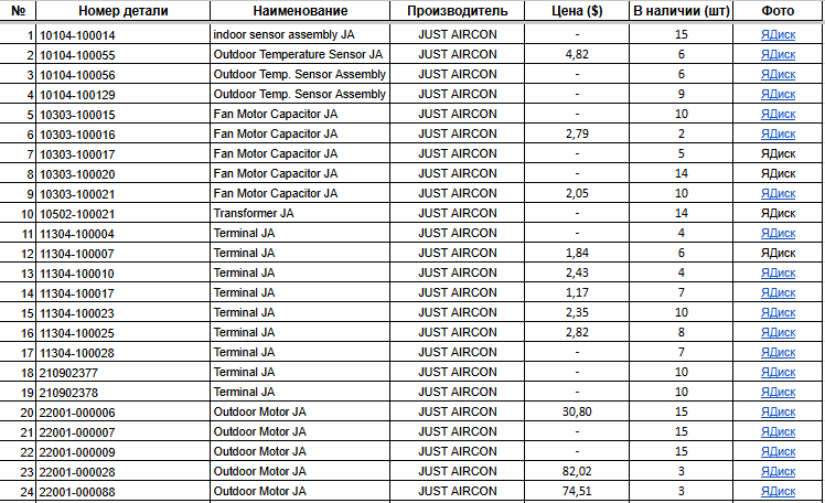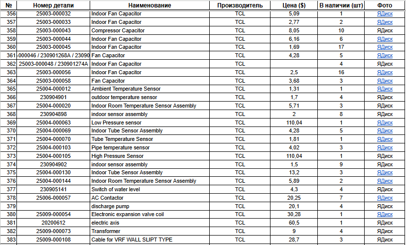 Подробная информация о всех запчастях FUJITSU GENERAL с ценой, количеством штук в наличии и фотографиями находится в таблице