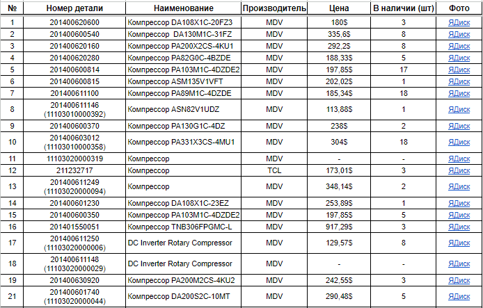 | 201400611249 (11103020000094) | Компрессор | MDV | 348,14$ | |